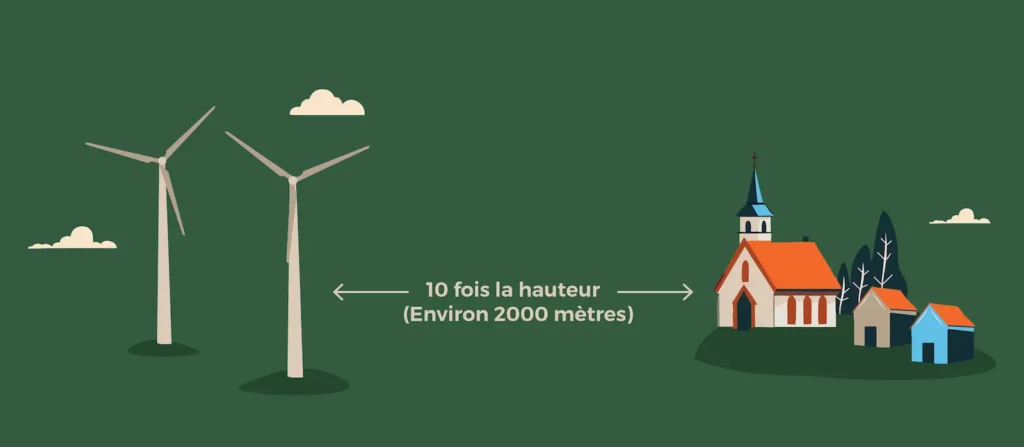 Ces images servent à illustrer certaines mesures du RCI. Elles ne constituent pas une représentation à l’échelle. Les proportions entre la hauteur de l’éolienne et celle des bâtiments, ainsi que la distance séparatrice entre l'éolienne et les bâtiments, ne reflètent pas la réalité.